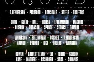 前锋:鲍文(西汉姆联)、勒温(利兹联)、埃泽(阿森纳)、福登(曼城)、戈登(纽卡斯尔)、凯恩(拜仁)、马杜埃凯(阿森纳)、拉什福德(巴萨)、萨卡(阿森纳)、索兰克(热刺)