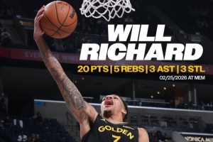 勇士官方晒出理查德海报,理查德成为自2012年4月16日的克莱·汤普森之后,首位打出这一数据的勇士新秀👏。