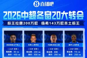 2026中超冬窗转会TOP20【注:数据参考德国转会市场网,20大转会综合球员德转身价、转会费以及体育资讯话题度,排名依照德转身价从高至低】