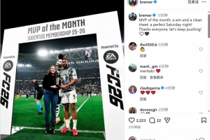 布雷默当选尤文2月份最佳球员,赛前他领取了奖杯,赛后布雷默社媒晒出领奖照片,并写道:“月最佳球员、胜利和零封,一个完美的周六之夜!感谢所有人,让我们继续加油!”