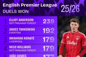 本赛季英超对抗成功次数排名: