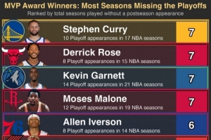前MVP球员生涯无缘季后赛次数历史排名: