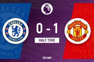 上半场伤停补时5分钟,半场结束,切尔西暂0-1曼联。