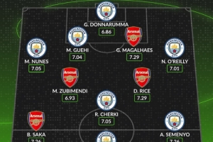 体育资讯4月19日讯 本轮英超焦点战曼城对阵阿森纳即将打响,数据网站Whoscored也列出本赛季两队球员在英超场均评分最高阵,其中曼城7人在列,具体如下: